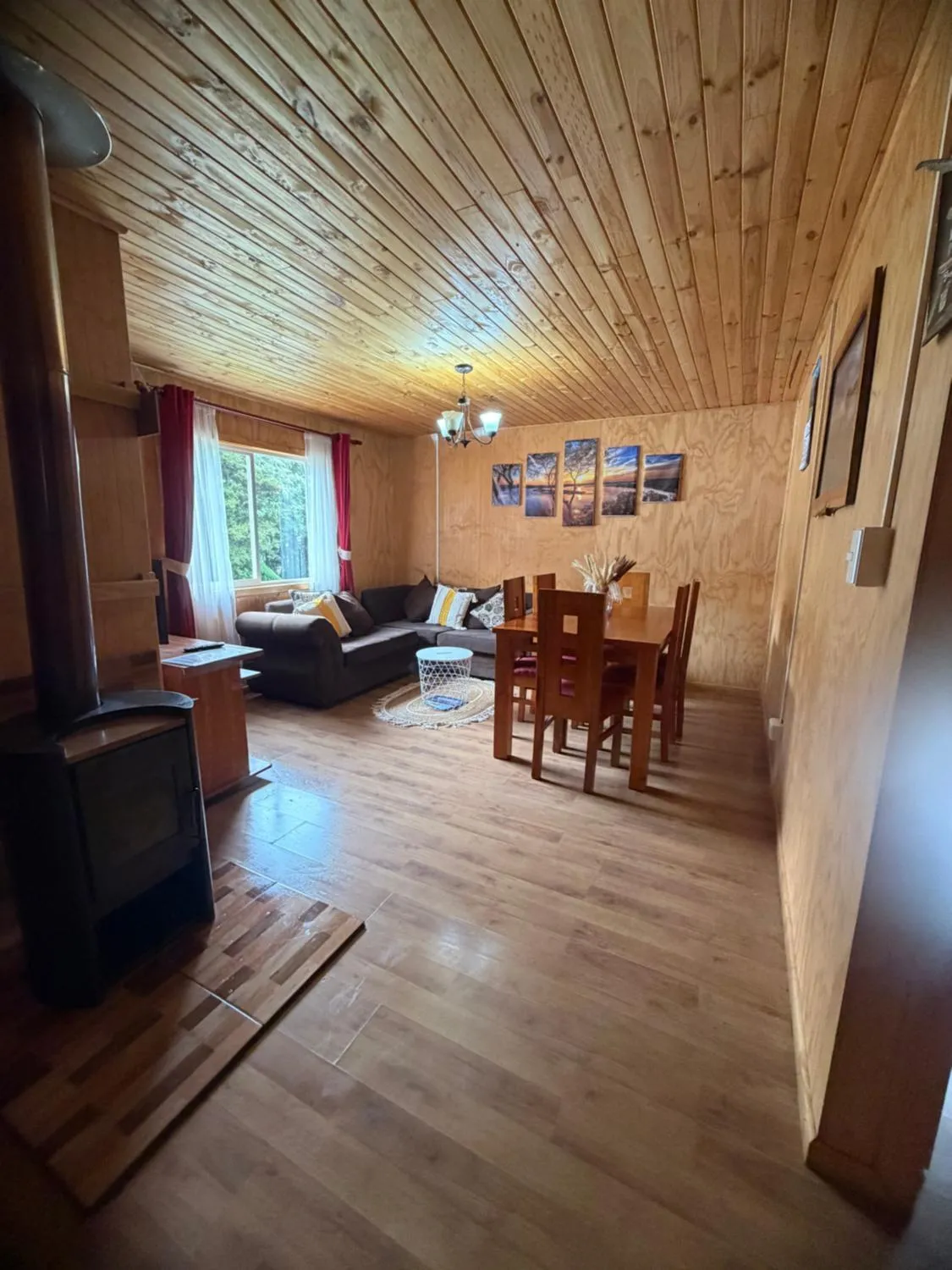 La política oficial detalla: “Recently renovated apartment with two bedrooms and a living room”. 74 m² — espacioso para la zona. Chimenea a leña (clave en la Austral lluviosa), baño con ducha, cocina equipada, entrada privada con patio y picnic area. Work desk para teletrabajo (WiFi intermitente según reseñas, normal en ruralidad Austral).