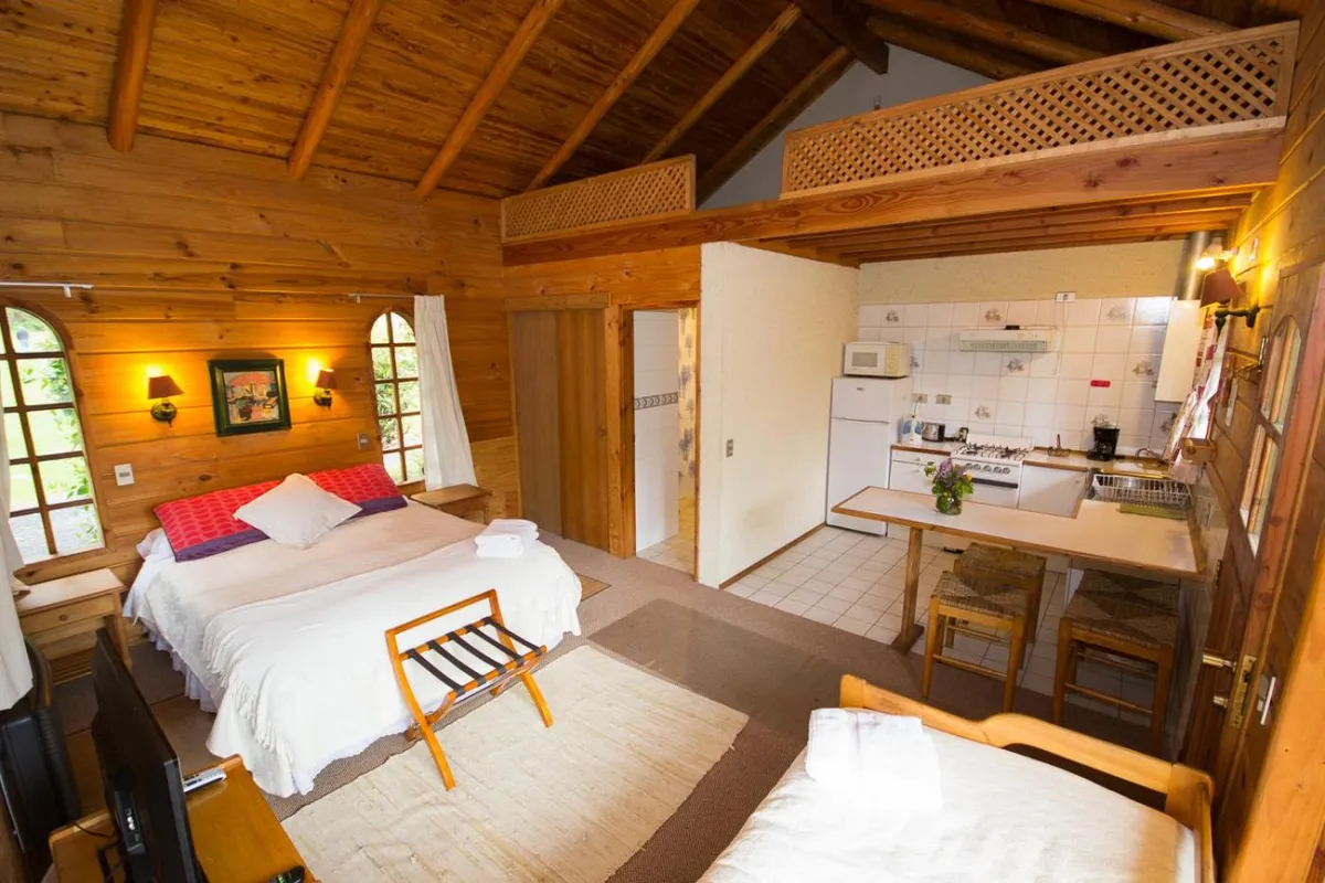 Ubicadas en el km 11 del camino Villarrica–Pucón, en el sector de Playa Linda, las Cabañas Playa Linda ofrecen acceso directo al lago Villarrica, piscina exterior y tres dormitorios para hasta 6 personas. El precio parte desde $85.219 por noche con puntuación de 9,2/10. La distancia al centro de Pucón —unos 10 minutos en auto— permite estar al lado del lago sin renunciar al acceso a la oferta gastronómica y de actividades del balneario.