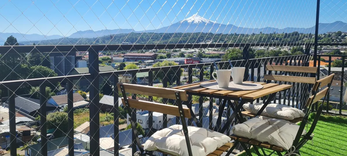 Departamento 54 m² para 4 en Villarrica, piso 11 con vista directa al lago y al volcán. Balcón, baño privado, estacionamiento. Nota 9.9/10 en Booking.